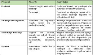 Për të analizuar rëndësinë e integrimit të përfshirjes së pronarëve të vegjël në zinxhirin e vlerës, në tabelën e mëposhtme analizohen proceset kryesore, aktorët dhe aktivitetet që përfshihen në zinxhirin e vlerës.